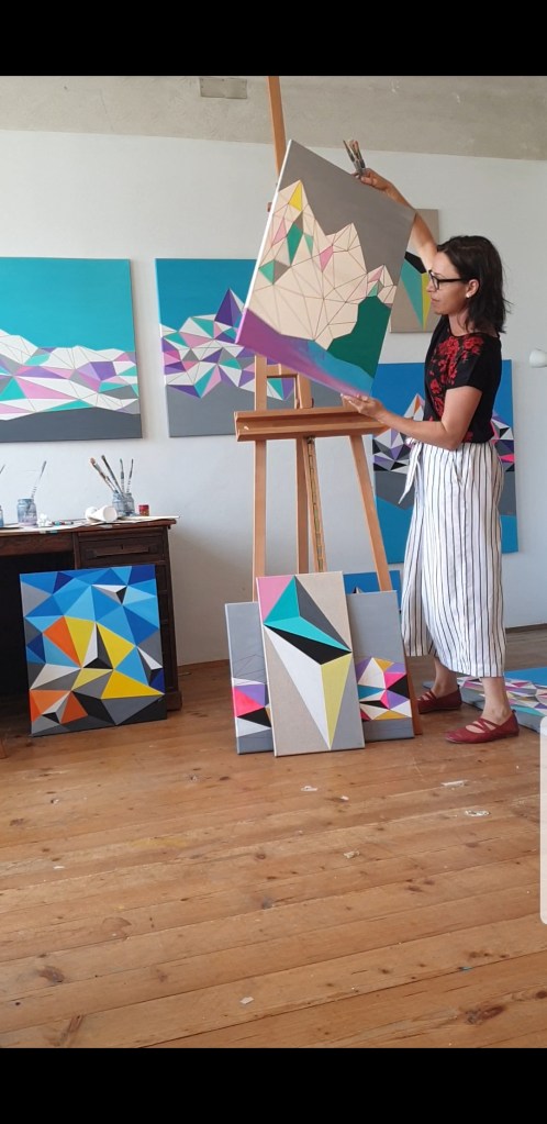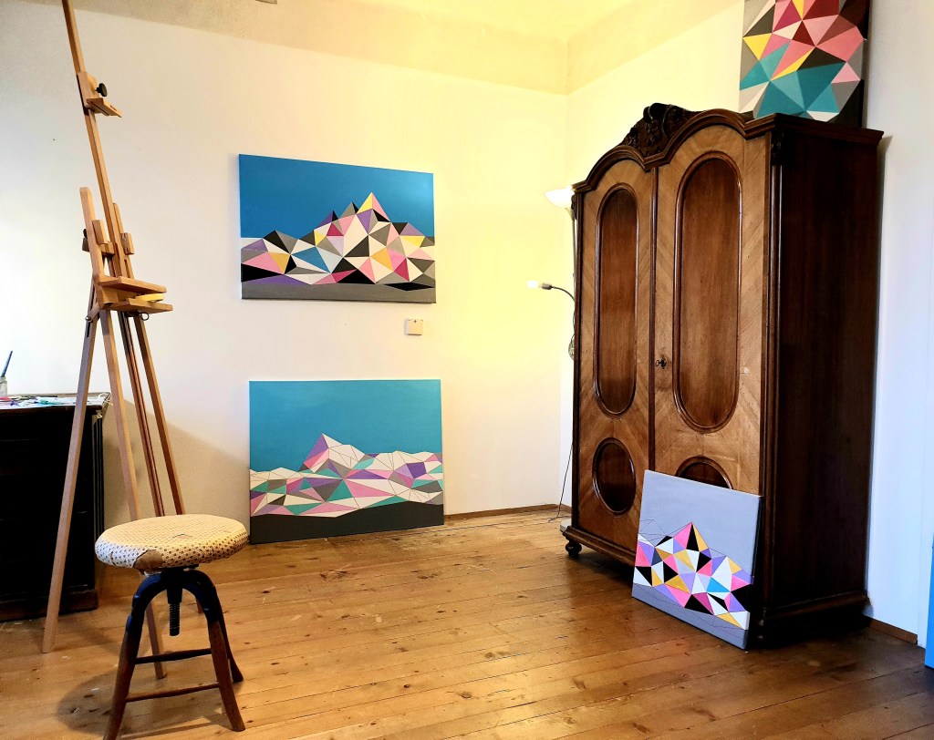 Kathrin Ferner-Wenzls geometrisch-abstrakte Landschaften strahlen eine Klarheit aus, gepaart durch Ruhe und Stärke. In ihren Bildern thematisiert sie den Berg als Ort der Sehnsucht und als Symbol der Kraft. Auf der Suche nach Harmonie – von Farben und Formen sowie letztendlich einem ausgewogenen Gesamtbild – experimentiert die Künstlerin in jedem Bild aufs Neue mit dieser persönlichen (und zugleich so existenziellen) Herausforderung. Mit ihrem ganz persönlichen Stil aus klaren Linien, Formen und Farben interpretiert die Künstlerin das klassische Genre der Landschaftsmalerei vollkommen neu. Ausgehend von der “Magie der weißen Fläche” exerziert die Künstlerin im überlegten Spiel mit Linien, Formen und Farben die Beschaffenheit des Berges, seine Schattenformationen und seine Wirkung als mögliche Erscheinungsformen dieses Bildgegenstandes durch. In zugleich mächtigen wie beruhigten Formationen türmen und breiten sich ihre gewaltigen Gebirgslandschaften harmonisch über die Leinwand aus. Gegenständlich als Landschaften – meist Berge und Gebirgsformationen – erkennbar, sind ihre Sujets aber auch als rein abstrakte Gebilde lesbar. Das Resultat sind Bilder, die durch ihre dreidimensionale Wirkung eine auf verschiedenen Ebenen wirksam werdende Anziehung und Faszination ausüben, den Betrachter auf einzigartige Weise in den Bann ziehen und letztendlich – gerade in einer herausfordernden Zeit – zur visuellen Herausforderung werden. Kraft und Stärke resultieren in purer Harmonie – als Suche nach einem Ausgleich der Kräfte.